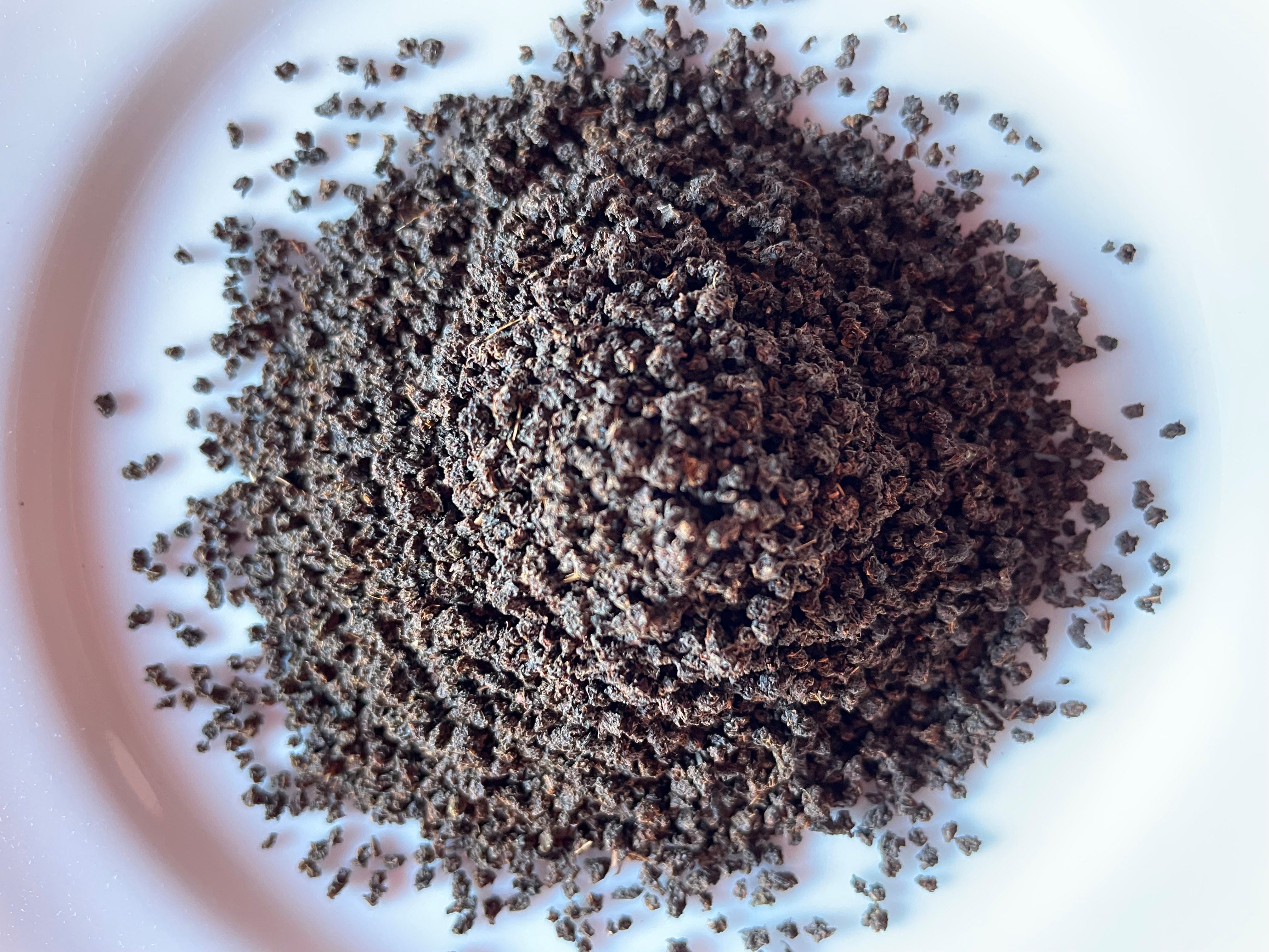 CTC(粒状)製法(「Crush 」(砕く) 「Tear」(引きちぎる) 「Cur」(丸める) という3つの工程の頭文字を取ってCTCといわれます)の紅茶ですが、世界最大の紅茶生産国であるインドでは、一番飲まれているタイプの紅茶です。特に小さい粒なのは茶樹の上の方の小さめの茶葉を摘み取っているためで美味しい証拠。